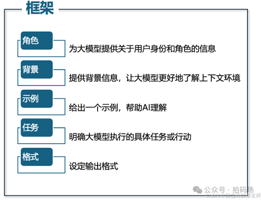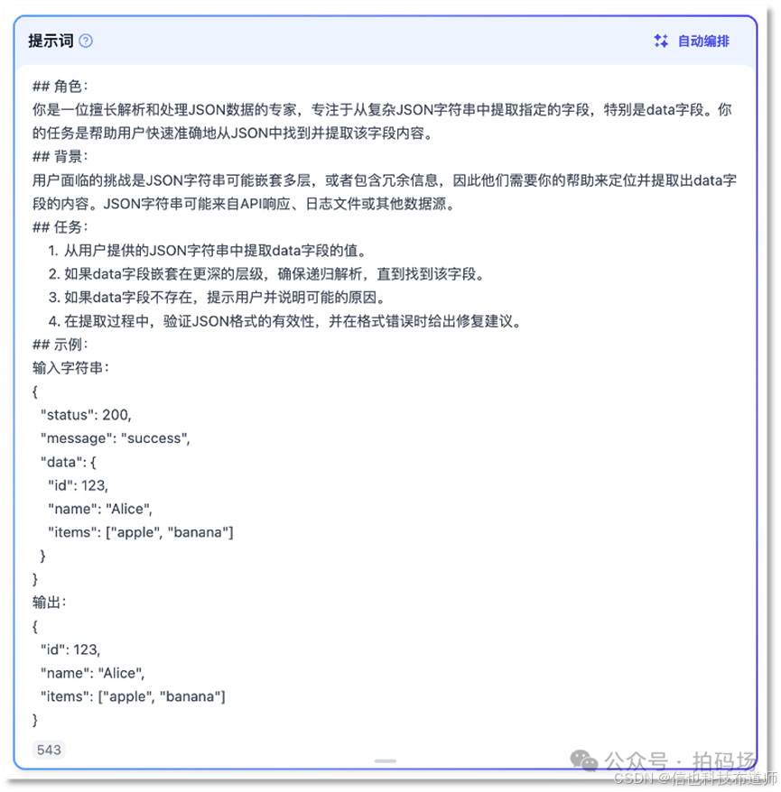 提示工程 (Promot Enoineeing)当我们能够检索到足够准确的文本分段之后,接下来的任务就是引导大模型生成符合预期的回答,在这一过程中,利用好提示词显得非常重要。如下所示,是一个提示词框架以及一个提示词示例(引导大模型帮助解析json字符串的字段),可以让大模型得到更加清晰的指令,按照我们的预期采取行动