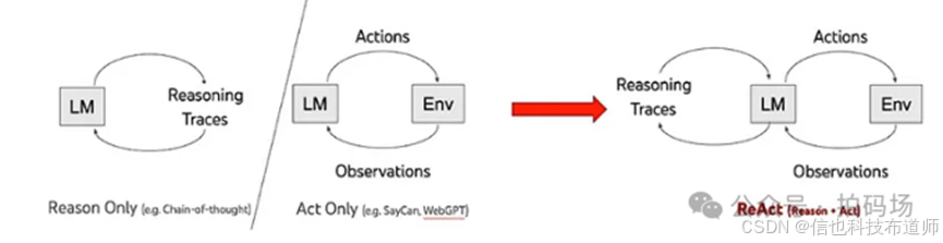 Reason and Act(ReAct)是一种人工智能技术框架,ReAct结合了推理和行动,通过交替执行一系列步骤(重复N次)——思考、行动和观察,使LLM能够解决复杂的任务。