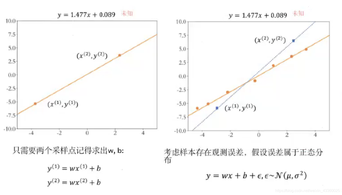 深度学习案例:回归问题问题分析优化方法代码采样数据计算误差计算梯度梯度更新main函数结果输出这篇文章将介绍深度学习的小案例:回归问题的问题分析、优化以及实现代码。问题分析如果只采样两个点则会存在较大偏差(如蓝色线),为减小估计偏差,可通过采样多组样本点:{(x(1),y(1)),(x(2),y(2)),...,(x(n),y(n))}\{(x^{(1)},y^{(1)}),(x^{(2)},y^