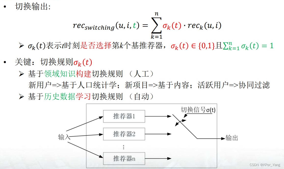 基本思想:在不同场景,针对不同用户,各种基推荐器的性能表现有较大差异。例如,针对活跃用户、热门项目协同过滤算法较好;针对新用户和不活跃用户,基于内容和人口统计学效果较好;针对冷门项目,基于内容的推荐算法较好;针对代价高昂且次数少的项目,使用基于知识的推荐算法效果较好。所以,在不同场景选择不同的推荐算法是一种明智的选择。