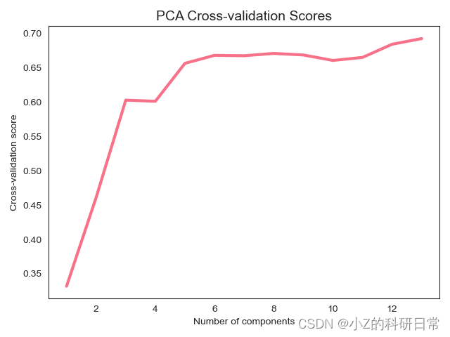 对于每个 n_components 值,我们都训练了一个 PCA 模型,并在交叉验证下计算了模型的 R2(即得分)。最后,我们可视化了 R2 分数与使用的主成分数量之间的关系。图表展示出降维数量与其得分的关系,为后续的PCA降维做好准备。