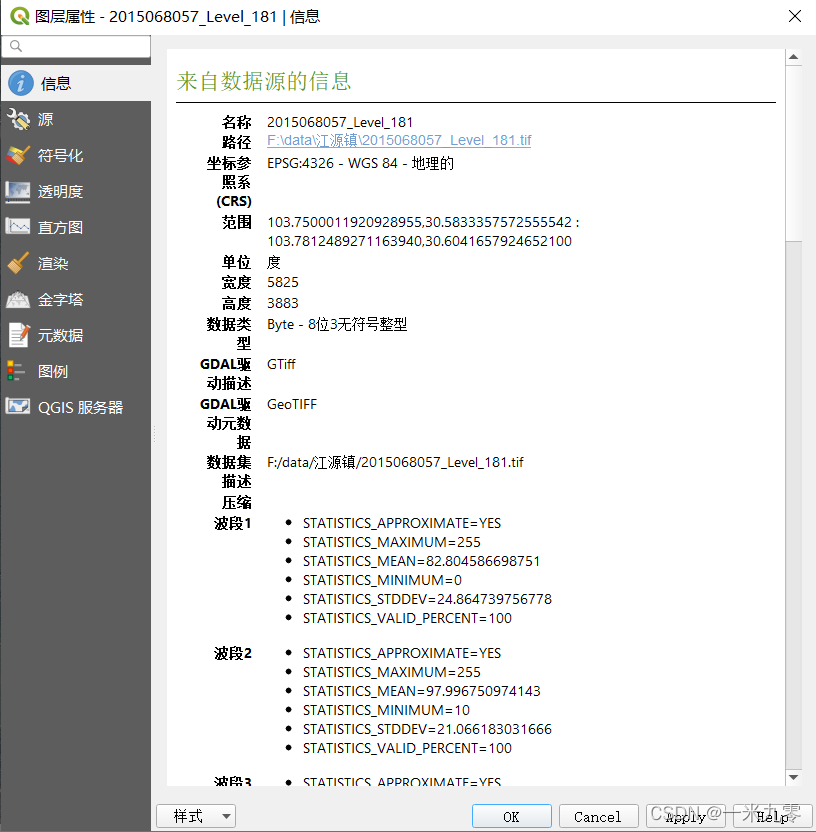 上图是我使用 QGIS 打开的一副遥感影像的基本属性,上图中 (CRS)范围中的数据对应着该遥感影像的左上角和右下角坐标;