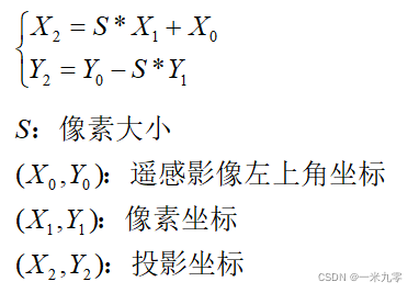 本文主要是对像素坐标转投影坐标、投影坐标转像素坐标的原理进行介绍及代码上的实现!!!一、.tif 影像基本信息介绍1、影像借本信息上图是我使用 QGIS 打开的一副遥感影像的基本属性,上图中 (CRS)范围中的数据对应着该遥感影像的左上角和右下角坐标;2、遥感影像左上角、右下角坐标和像素大小、宽度、高度之间的关系二、投影坐标与像素坐标间的转化原理1、像素坐标转投影坐标2、投影坐标转像素坐标三、代码