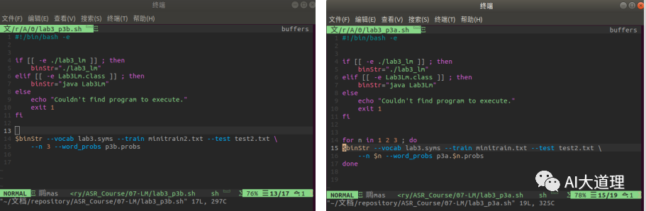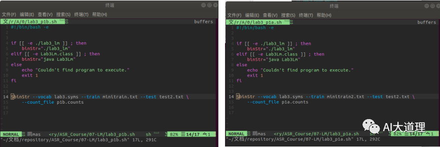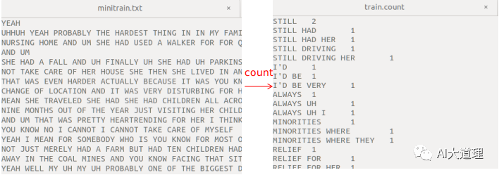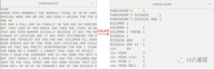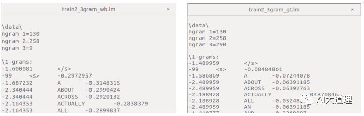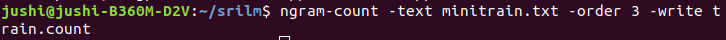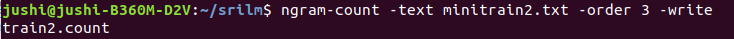 其中,ngram-count是srilm的命令,词频统计的对象是minitrain2.txt和minitrain.txt,order3表示3-gram语言模型,生成train2.count文件和train.count。