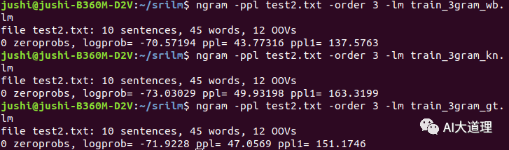 100个句子的语言模型,测试文件使用的是 text2.txt文件,测试模型使用Kneser-Ney平滑算法训练、witten bell平滑算法训练、Good-Turing平滑算法训练。