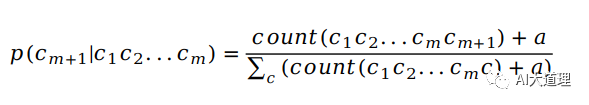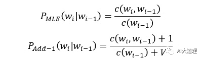 思想:将每个计数加一,从而使得任何词序列都有计数,这样的话就可以把本来概率为0结果变为一个很小的值。为了保证所有实例的概率总和为1,将分母增加实例的种类数;即: