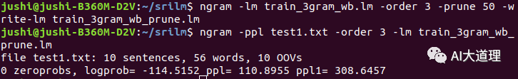 10个句子的语言模型训练,使用Kneser-Ney平滑算法进行语言模型训练命令: