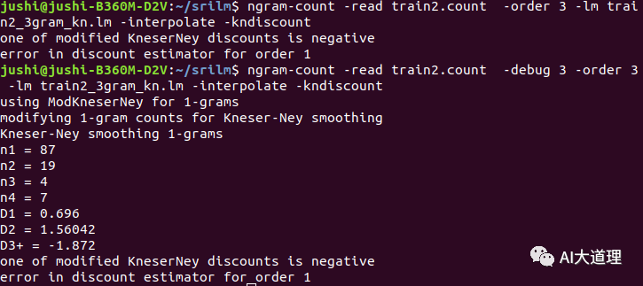 原因:其中一个修改后的KneserNey折扣为负,数据集太少,发现高阶n-gram没有出现统计次数。