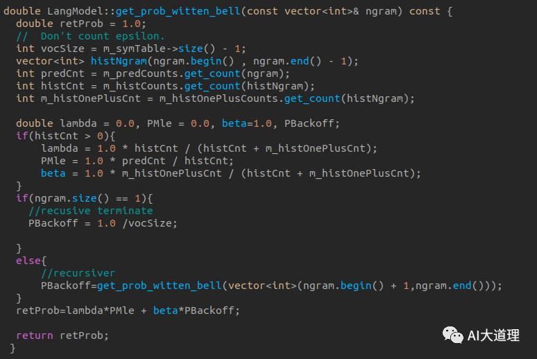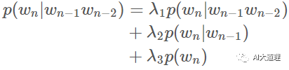 思想:用线性差值把不同阶的 N-gram 结合起来,这里结合了 trigram,bigram 和 unigram。用 lambda 进行加权。