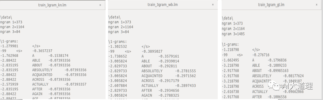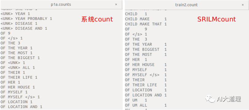 (与搭建的系统统计结果看似不一样,实际上只是排序不一样,上面的系统按照字典里面的词顺序进行排序,使用SRILM进行统计按照文本里面的词顺序进行排序。)
