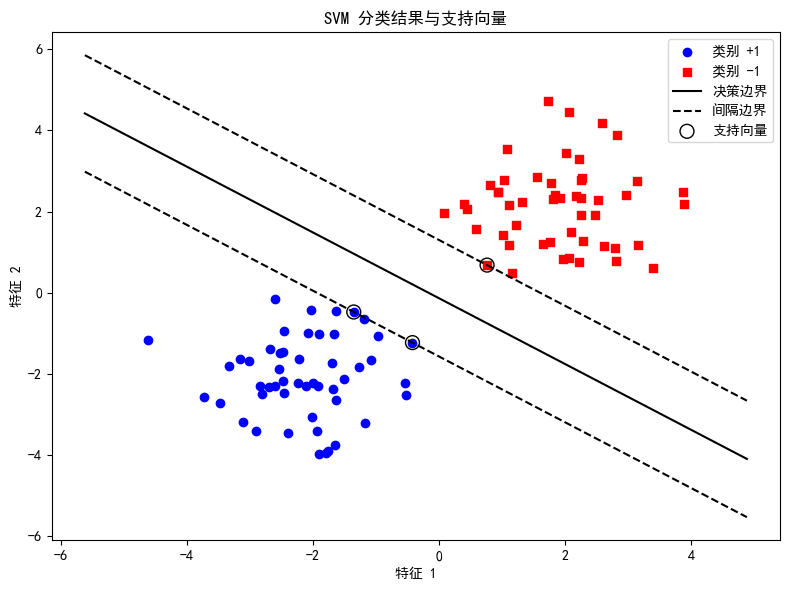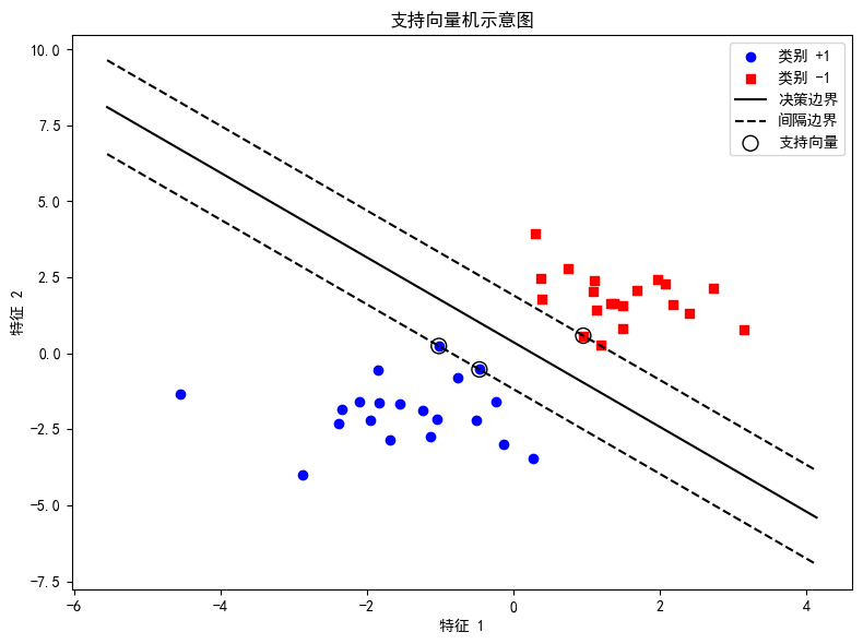 间隔(Margin):分界线到两侧最近样本的距离之和,SVM 目标是最大化这个间隔,以提高模型的泛化能力。