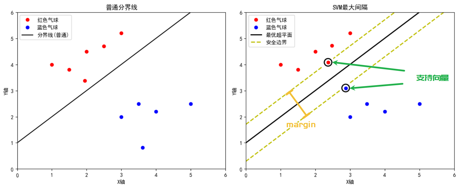 支持向量:离分界线最近的“哨兵”样本(图中被圈出的气球),这些点决定了超平面的最终位置和方向。