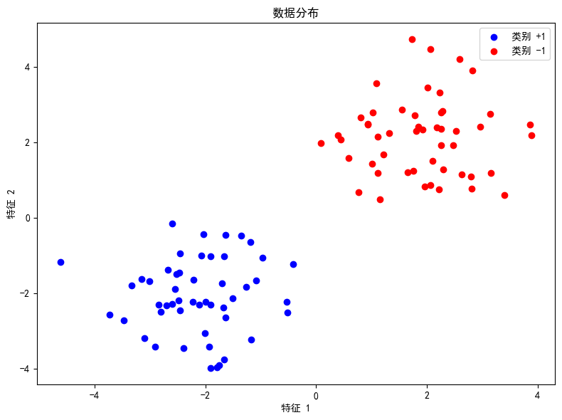 在本例中,我们使用人工生成的数据集来模拟两个类别的分布情况。首先对数据进行可视化,以便更直观地理解数据分布情况。