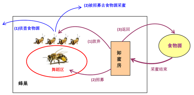 跳摇摆舞为所对应的食物源招募更多的蜜蜂,然后回到食物源采蜜;