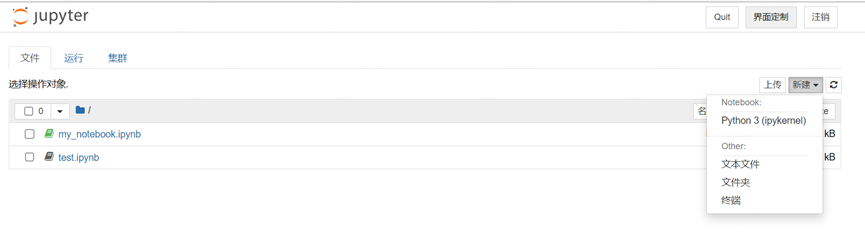 在Jupyter 工作区管理界面,用户可以灵活地以类似文件系统的方式管理工作区的数据。可以创建文件和文件夹,编辑文件和文件夹,可以上传和下载文件。通过选择一个Jupyter内核,可以创建一个Notebook文件。