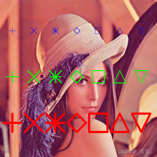下面开始画图,在lena.jpg中画三行标记符,每一行显示7中不同的符号,并用不同的颜色显示每一行标记符,第一行标记符1个像素宽度,第二行标记符2个像素宽度,第三行标记符5个像素宽度。效果如下: