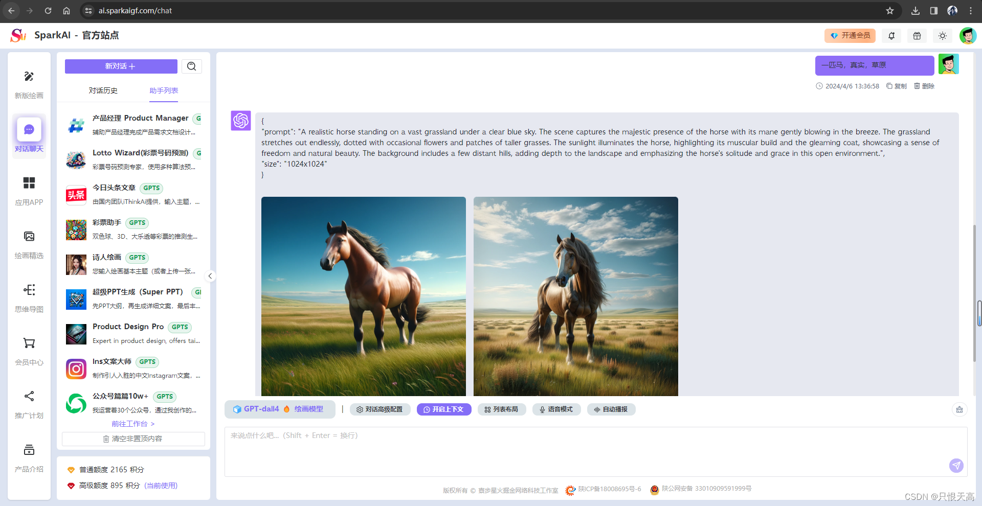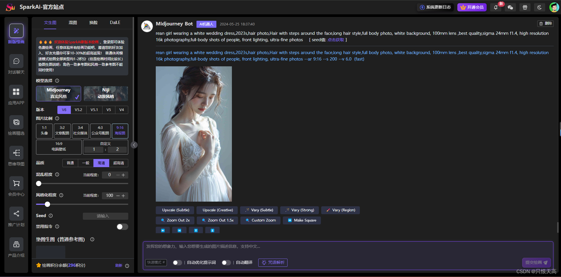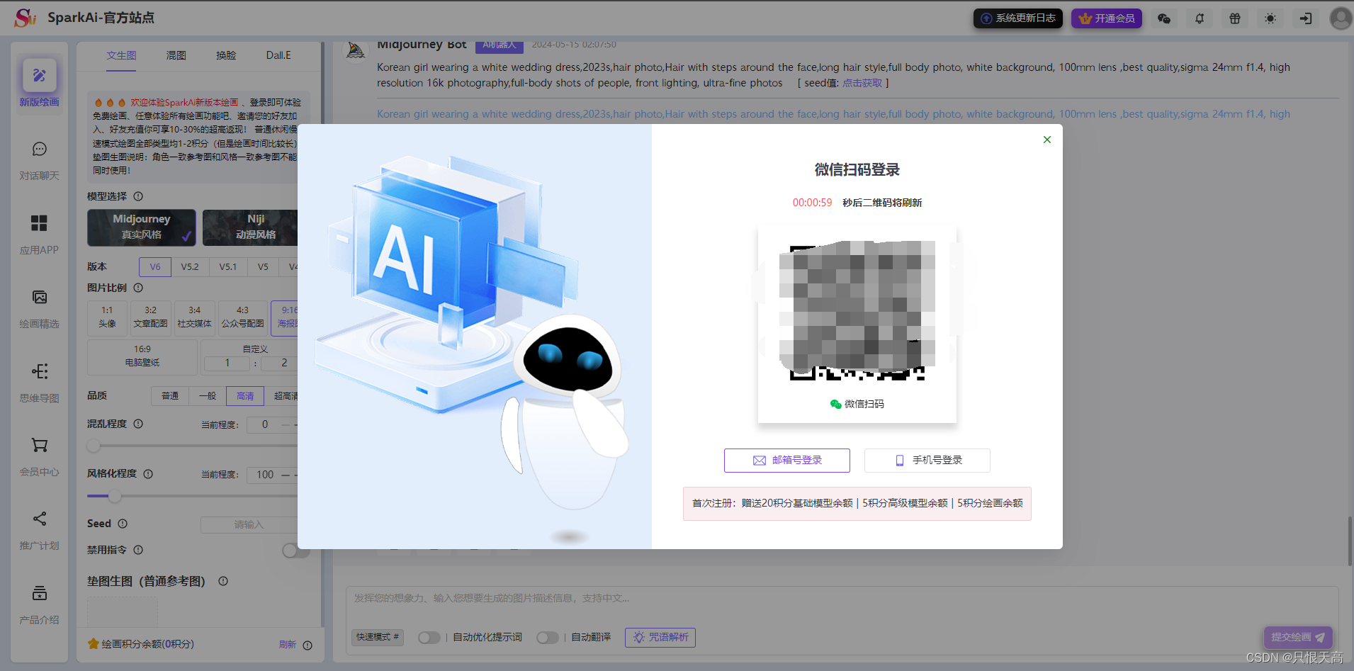 SparkAi创作系统是基于ChatGPT进行开发的Ai智能问答系统和Midjourney绘画系统,支持OpenAI-GPT全模型+国内AI全模型。支持GPT-4o大模型、文档分析、识图图片理解、GPTs应用、GPT语音对话、联网提问、GPT-4全模型、DALL-E3文生图、GPT4-All联网搜索模型、思维导图、会员套餐功能、分销系统、Midjourney绘画动态全功能、AI换脸、垫图混图、Va