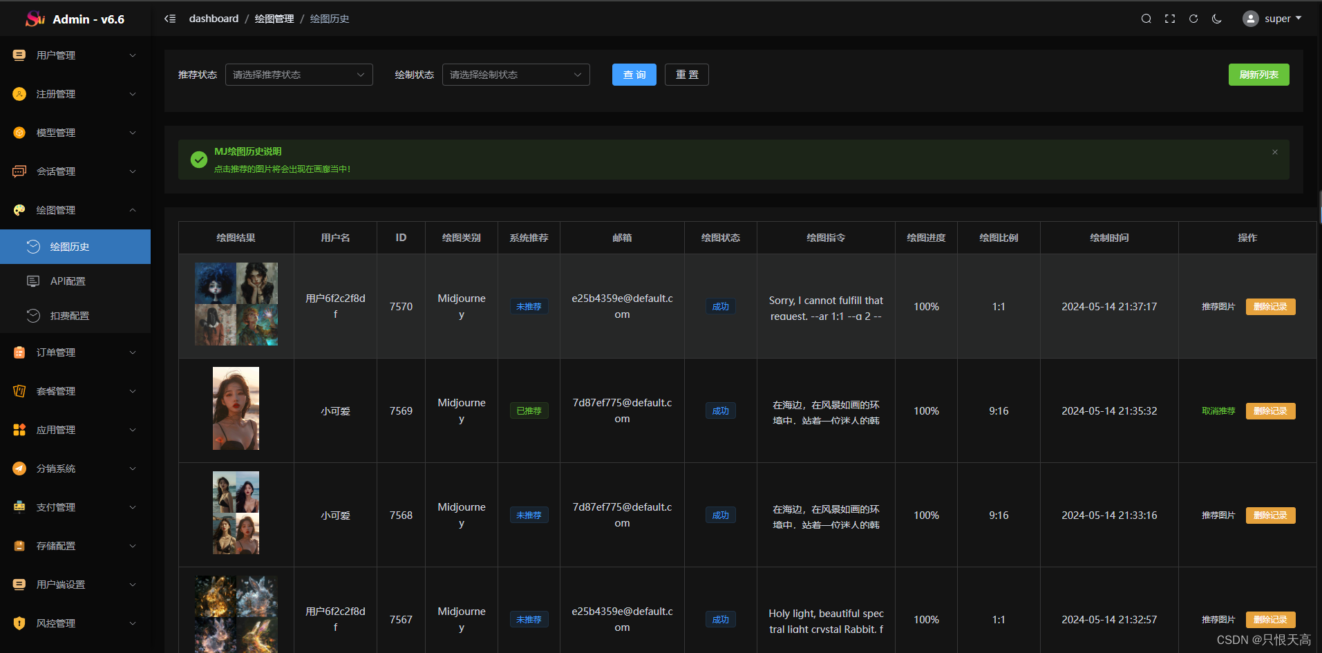 绘画广场: 展示ai绘画的内容、展示推荐内容、管理端可手段推荐图片