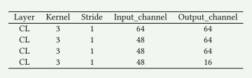CL是带有Leaky ReLU的3*3卷积,Split是通道拆分,四个卷积层的参数如下表: