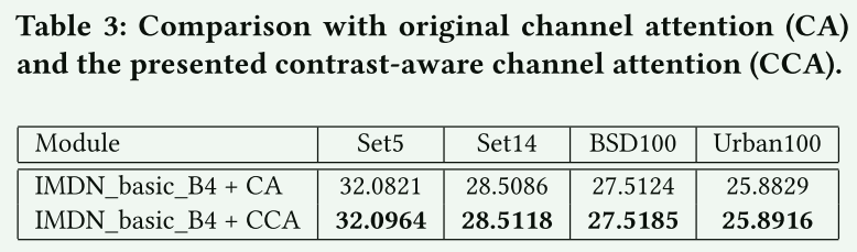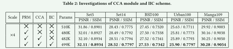 为了研究IMDB中PRM的效率,我们用三个级联的3×3卷积层(64个通道)替换它,并删除最后的1×1卷积(用于融合)。 比较结果如表 2 所示。尽管该网络具有更多参数(510K),但其性能远低于我们的 IMDN_basic_B4(480K),尤其是在 Urban100 和 Manga109 数据集上。