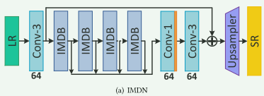 信息多重蒸馏块 (IMDB) 由渐进细化模块(PRM)、对比感知通道注意 (CCA) 层和用于减少特征通道数量的 1 × 1 卷积构成。 整个块采用残差连接。 该块的主要思想是像 DenseNet 一样一点点地提取有用的特征。