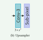 这是最终的上采样器,由一个可学习的卷积层和非参数操作(子像素卷积)组成。