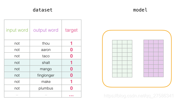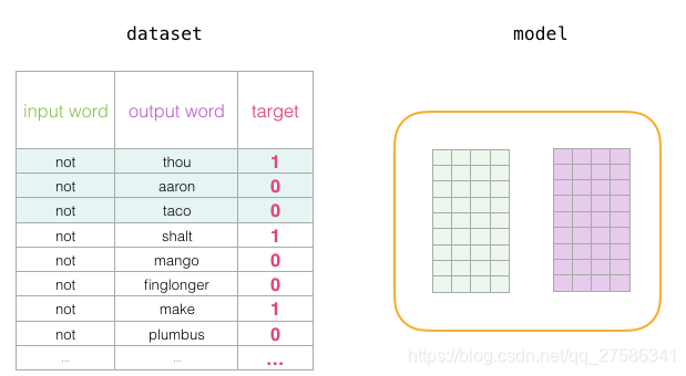 在训练过程开始时,我们用随机值初始化这些矩阵。然后我们开始训练过程。在每个训练步骤中,我们采取一个相邻的例子及其相关的非相邻例子。我们来看看我们的第一组: