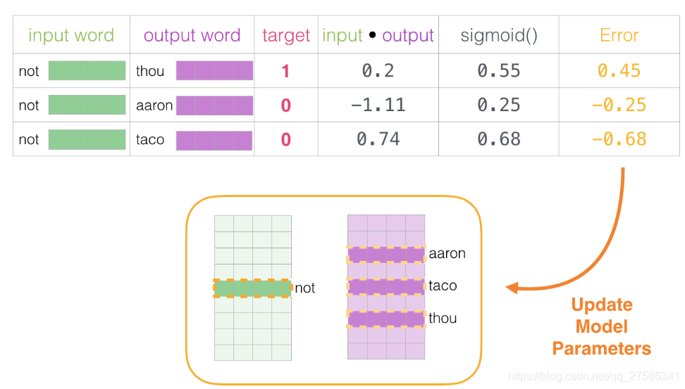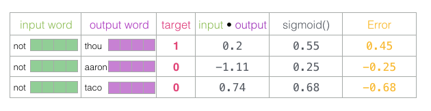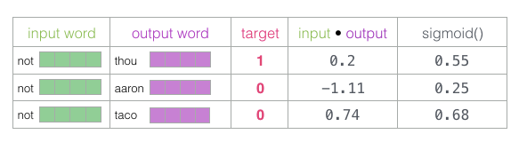 现在我们有四个单词:输入单词not和输出/上下文单词: thou(实际邻居词),aaron和taco(负面例子)。我们继续查找它们的嵌入:将单词转换为向量表示形式