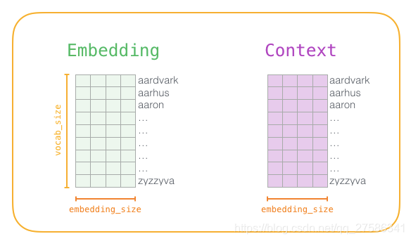 在训练阶段的开始,我们创建两个矩阵——Embedding矩阵和Context矩阵。这两个矩阵在我们的词汇表中嵌入了每个单词(所以vocab_size是他们的维度之一)。第二个维度是我们希望每次嵌入的长度(embedding_size——300是一个常见值,但我们在前文也看过50的例子):行数=词汇表的大小,列数=词向量的维度