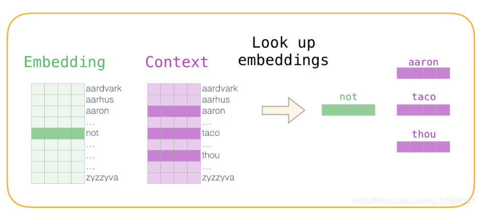 对于上下文单词,我们查看Context矩阵。(即使两个矩阵都在我们的词汇表中嵌入了每个单词)