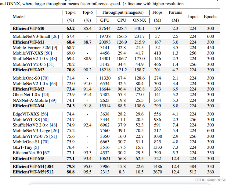 视觉变压器由于其高模型能力而取得了巨大的成功。然而,它们卓越的性能伴随着沉重的计算成本,这使得它们不适合实时应用。在这篇论文中,我们提出了一个高速视觉变压器家族,名为EfficientViT。我们发现现有的变压器模型的速度通常受到内存低效操作的限制,特别是在MHSA中的张量重塑和单元函数。因此,我们设计了一种具有三明治布局的新构建块,即在高效FFN层之间使用单个内存绑定的MHSA,从而提高了内存效