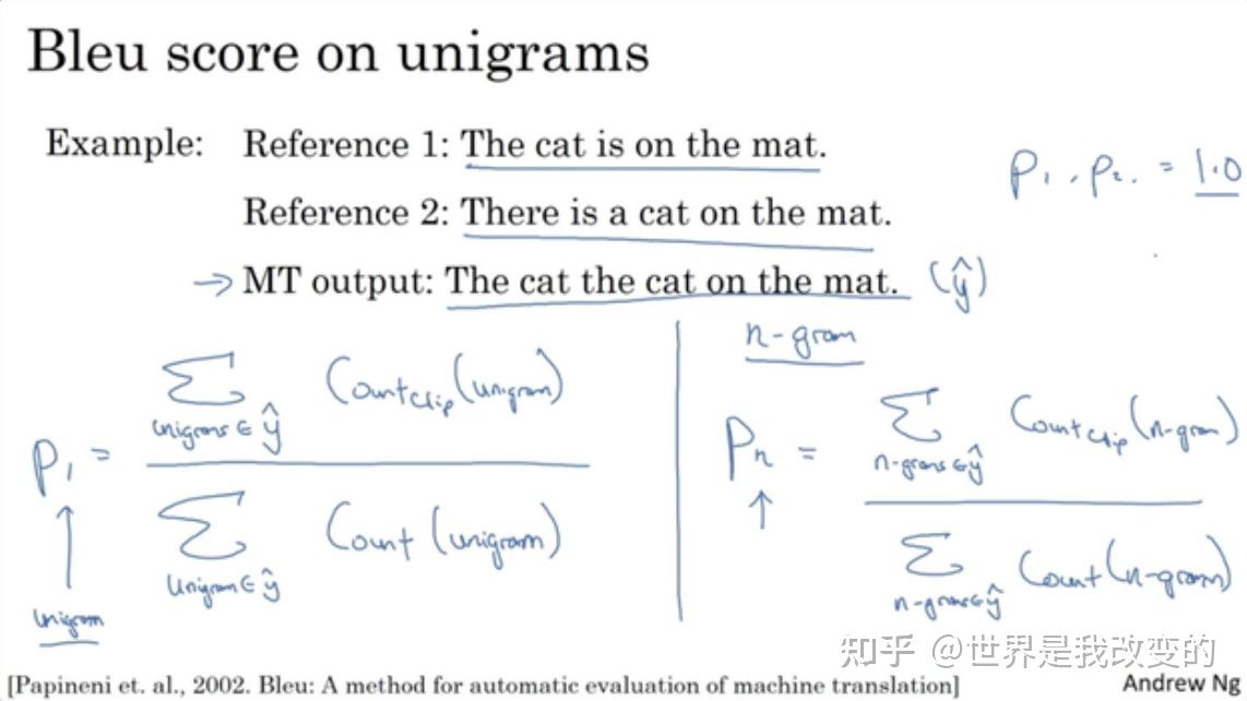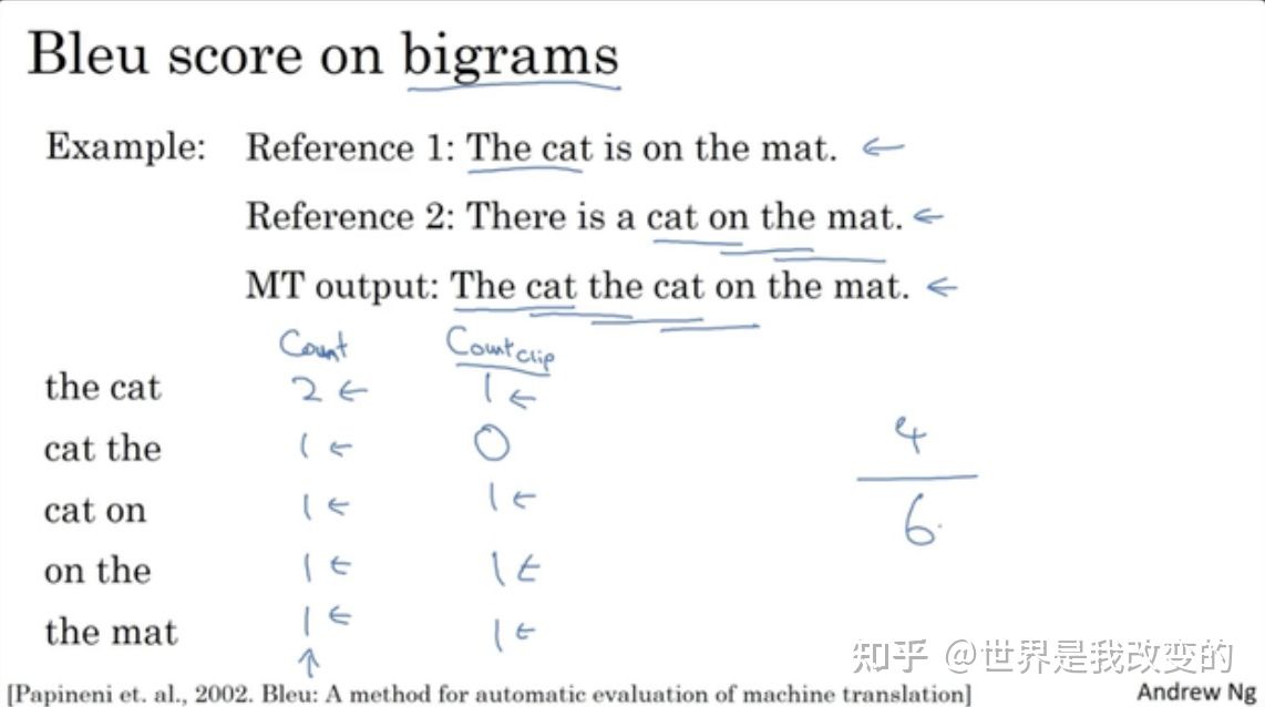 其次 在 Bleu score 中,我们不仅关注 单词,还关注词组(其实就是相邻的词对 bigrams)