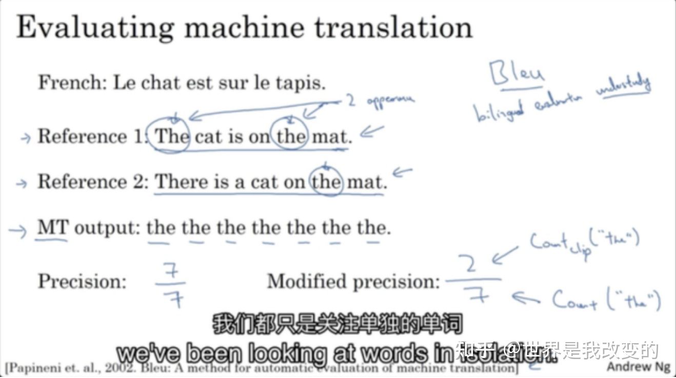 - 一种方法叫做 Precision(精确度):看机器翻译的每一个词,有没有在翻译参考中出现。在上面的案例中,虽然全是 the 是一个非常糟糕的翻译结果,但是 Precision = 7/7 = 1(感觉这种衡量方法不靠谱)