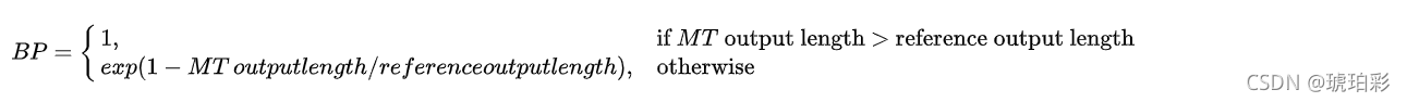 其中,BP是简短惩罚因子,惩罚一句话的长度过短,防止训练结果倾向短句的现象,其表达式为: