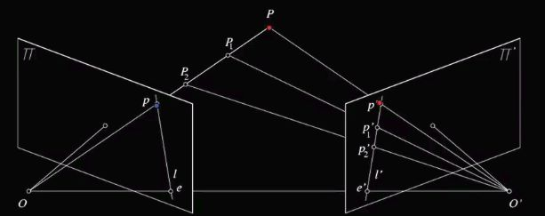 上图O和O'是两个相机中心,P点是物体所在,如果我们只看左边图像 上的点p,我们不能知道物体到底是在哪,点P1、P2或其他地方,可有了右边图像