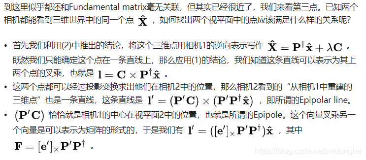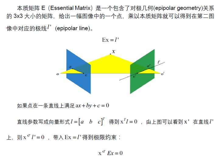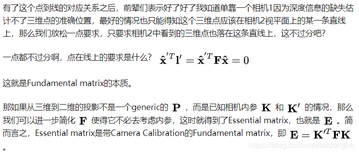 前面的相机矩阵,是针对单个相机的,可我们知道单个相机图片并不能告诉我们物体的深度信息,这时至少需要两个相机,这样在两视图间内在的射影几何关系就是对极几何,而基本矩阵就算对极几何的代数表示。
