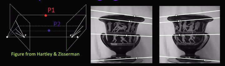 我们可以看到在左图对极平面旋转时对极点是不变的,而在相机图像上所有对极线都会交于对极点,这个对极点就是另一个相机中心在其图像上的像,当然正如右图所示,对极点可以在图像外。