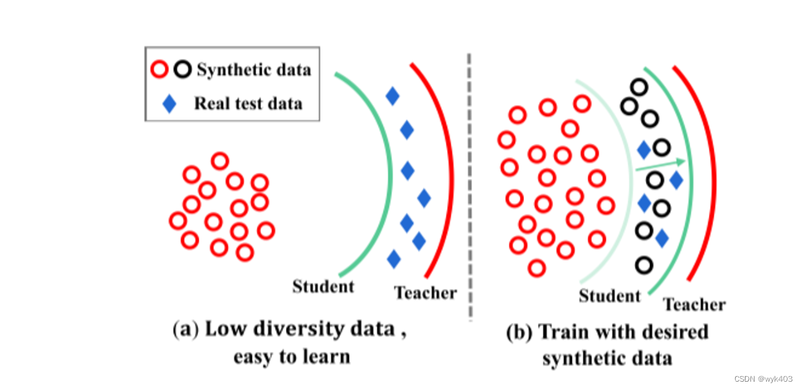 - 合成数据与决策边界的关系:通过使用交叉熵(CE)损失和批量归一化(BN)损失,虽然可以训练出能够生成合成数据的生成器,但观察到这些合成数据通常距离集合模型(作为教师模型)的决策边界较远。这导致了一个问题:教师模型难以将其知识有效地传递给全局模型(即学生模型)。我们的目标是学习全局模型的决策边界,并对真实的测试数据(蓝钻)具有较高的分类精度。