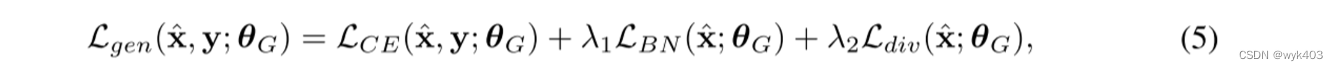 - 将噪音图片输入生成器得到合成图片,再将合成图片送入客户端模型中计算平均logits值,选取logits而不是Pred的类别是因为Pred会泄露客户端信息,然后与随机标签计算交叉熵,该损失函数相当于用于分类的主损失函数,但只有该损失函数无法取得良好训练,因为客户端存在non-IID数据