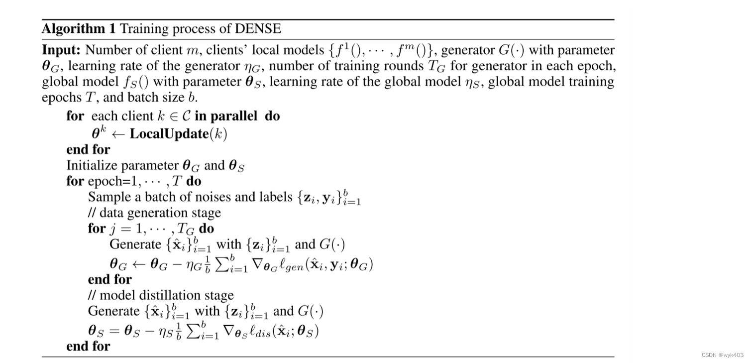 我们提出了一种名为DENSE的新方法,该方法在考虑模型异质性的同时,不需要共享额外的信息或依赖任何辅助数据集,即可进行一次性FL。学习过程如图1所示,DENSE的整个训练过程如图算法1所示。