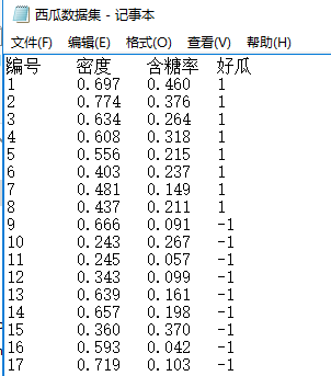 为了加深自己的理解和提高自己的动手能力,于是便想以西瓜书p89页上的西瓜数据集为例,在该数据集上应用基于单层决策树的AdaBoost算法。心动不如行动,于是参考另外一本书《机器学习实战》,开始了从理论到实践的尝试。本文的代码全部都是采用python 3.6版本进行编写的。在开始之前,我将数据集存放在一个名为“西瓜数据集.txt”的文件中,其中1表示好瓜,-1表示坏瓜,如下图所示: