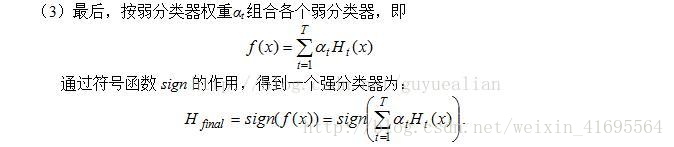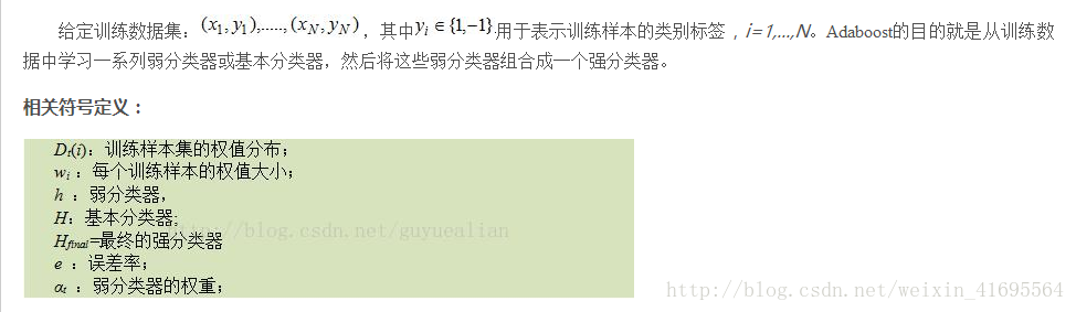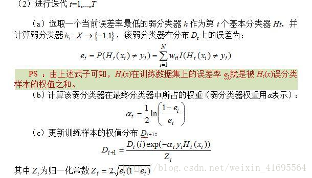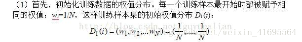 AdaBoost是adaptive boosting(自适应boosting)的缩写,其运行过程如下:训练数据中的每个样本,并赋予其一个权重,这些权重构成了权重向量D。一开始,这些权重都初始化成相等值。首先在训练数据上训练出一个弱分类器并计算该分类器的错误率,然后在同一数据集上再次训练弱分类器。在分类器的第二次训练当中,将会重新调整每个样本的权重,其中第一次分对的样本的权重将会降低,而第一次分错的样本的权重将会提高。为了从所有弱分类器中得到最终的分类结果,AdaBoost为每个分类器都分配了一个权重值alpha,这些alpha值是基于每个弱分类器的错误率进行计算的。计算出alpha值之后,可以对权重向量D进行更新,以使得那些正确分类的样本的权重降低而错分样本的权重升高。在计算出权重向量之后,AdaBoost又开始进入下一轮迭代。AdaBoost算法会不断的重复训练和调整权重的过程,直到训练错误率为0或者弱分类器的数目达到用户的指定值为止。算法过程如下所示: