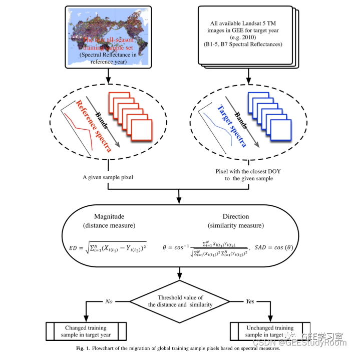 GEE学习室是一群由认真学习和使用GEE等遥感大数据平台的高校博士生(含在读和已毕业)组建的团队,致力于GEE等大数据原创和优质算法开发,希冀通过团队的努力为遥感大数据智能处理普及和广大学子科研之路提供。再次说明,本文只实现了简单的过程,具体效果和原文有偏差可以理解,诸君自行甄别。当然,这种迁移从现有技术标准等角度来看还是一种朴素的方法,但是这篇论文作为样本迁移研究的pioneer,还是很值得学习