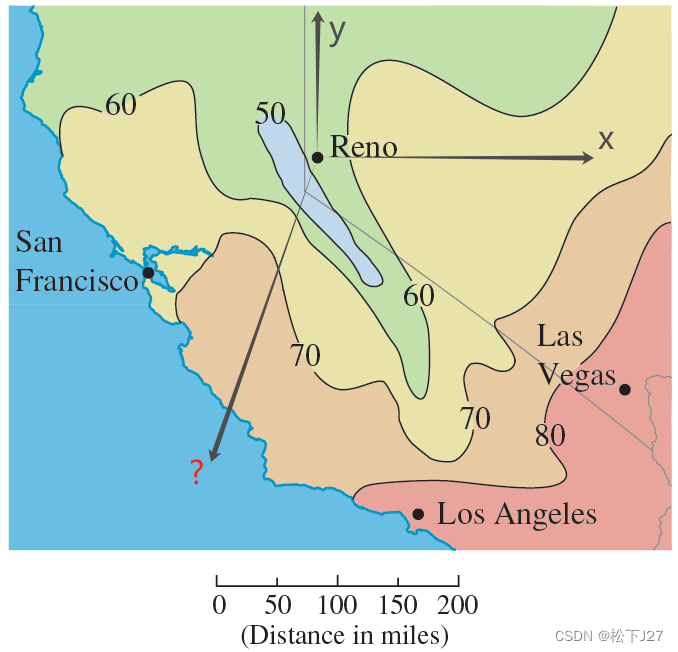 上图为一温度图,所反映的是加利福利亚洲和内华达州在十月的一天下午三点的温度。其中,图中的每一点都是温度T关于x,y的函数,即T(x,y)。对于图中的Reno市而言,沿着x方向的偏导反映的是温度沿着x方向,即沿着东方的变化率。沿着y方向的偏导