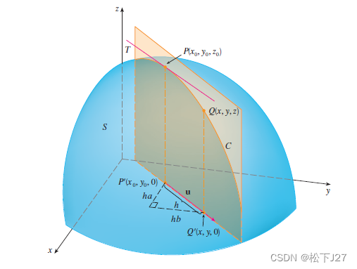 对上图而言,已知曲面S是二元函数z=f(x,y)在三维坐标系中的函数图像,其中z0=f(x0,y0)。点P(x0,y0,z0)为曲面S上的一点。此外,单位向量i=[1,0]表示沿x轴方向,单位向量j=[0,1]表示沿y轴方向,任意方向的单位向量u=[a,b]=ai+bj。沿方向u的垂直平面与曲面S的交线为C,该曲线上过P点的切线T的斜率即为z在方向u上的变化率,也就是函数在u方向上的导数。
