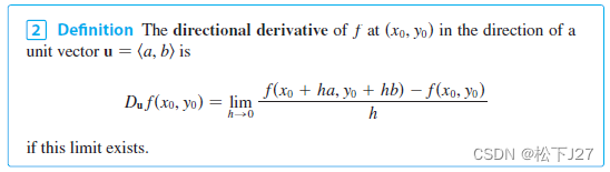 取h趋近于0的极限,得到函数在方向u上的瞬时变化率,这就是函数f在方向u上的方向导数: