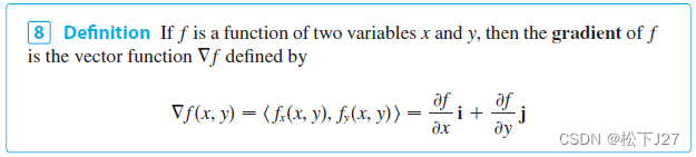 如此一来,我们就把方向导数的公式写成了两个向量的内积或点积的形式。如果我们暂时用“▽f”来表示上式中点积前面的那个向量: