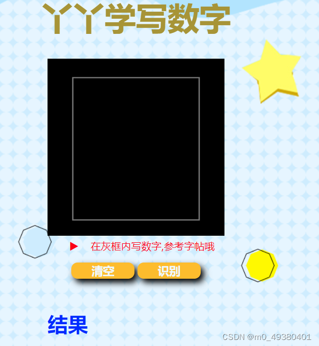 首先可以考虑构建一个简单的页面用于用户输入,也就是前端;接下来需要准备一个后端用于调用模型进行预测。具体逻辑是:当用户在前端页面输入一个数字后,点击“识别”按钮,程序通过HTTP请求发送用户输入的数字到后端,之后由模型进行预测,返回预测值给用户,即返回识别结果。模型识别数字效果好坏决定了用户的体验是否良好,我们期望的是程序能够大概率准确识别用户输入的数字。