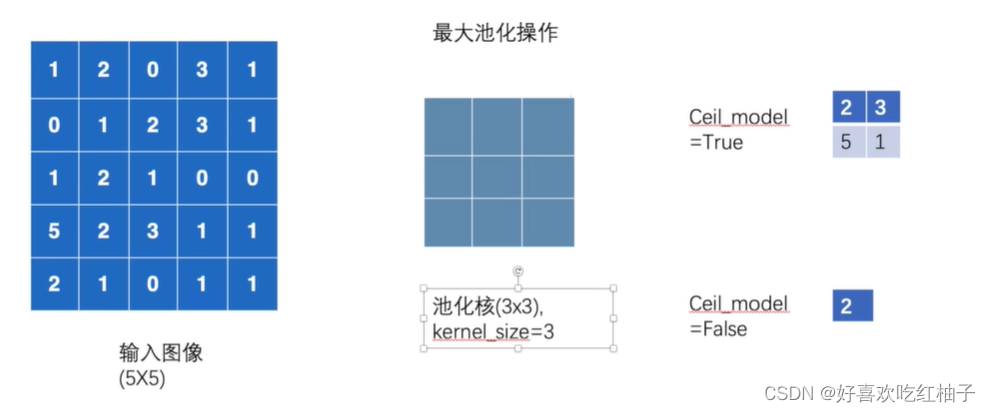 输入tensor矩阵为5*5,如下图所示,池化核为大小为3*3,经过池化后根据ceil_mode的不同应输出下图所示的两个矩阵,输出如下的采样结果。