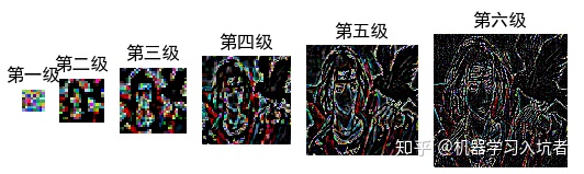 对于前文得到的高斯金字塔,现在可以构建对应的拉普拉斯金字塔如下(第1级为高斯金字塔中最小尺寸的图,也就是高斯金字塔最后1级;为了下图看起来更明显我进行了伽马矫正):